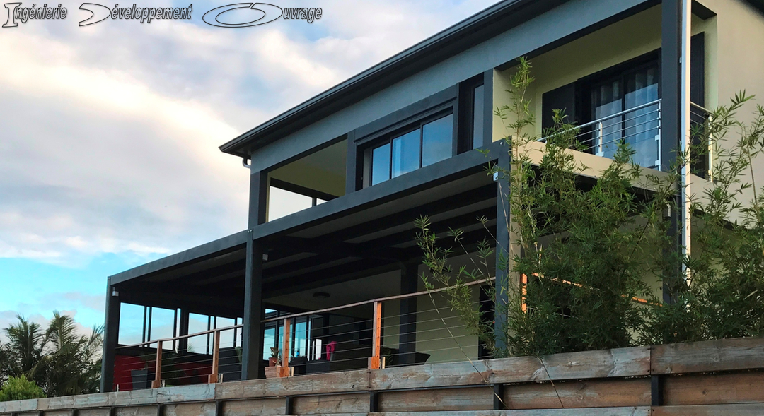 Véranda sur mesure assortie à la façade d’une villa moderne : Poteaux métalliques similaires aux poteaux béton existants, gouttière cachée dans la poutre, descentes d’eau intégrées dans les poteaux d’angles, couverture isolante (soleil) a sous-face lisse…